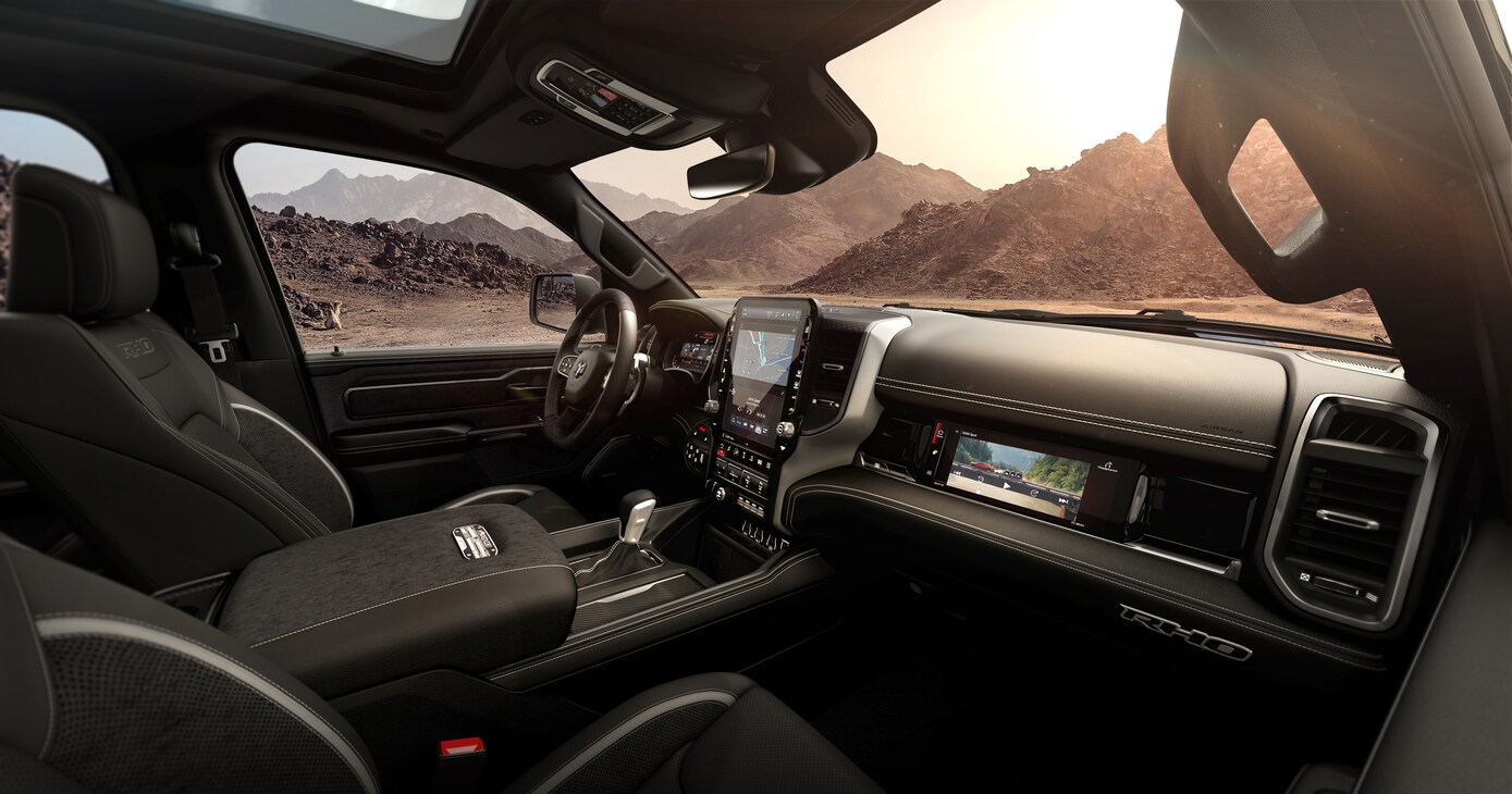 Standalone technology features for the Ram 2500 include a 17-speaker sound system, a 12-inch touchscreen, a wireless charging pad, and noise-canceling technology for the main cabin.